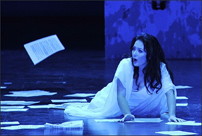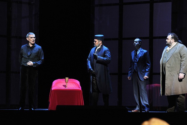 El Liceu ha decidido reponer la producción de José Luis Gómez que se estrenara en Enero de 2009, habiéndose encargado de esta reposición Susana Gómez. La producción se centra en lo que José Luis Gómez considera que es el autentico drama que ofrece la ópera, que no se circunscribe a ningún momento histórico en su visión de la misma. Para ello nos ofrece una producción minimalista, tan en boga últimamente, y que no necesita de mayores profundidades filosóficas. Al propio tiempo, traslada la acción a tiempos modernos, a juzgar por el vestuario, difícil de ubicar en el tiempo, ya que la supuesta intemporalidad de la trama le hace mezclar épocas. Las transposiciones no son criticables en sí mismas, pero requieren un gran cuidado por parte del director de escena para que el libreto no chirríe, y un importante trabajo de actores, especialmente en un escenario desnudo. En este sentido la labor del director de escena no ofrece mucho de interés, quedándose en la superficie de las cosas. La escenografía de Carl Fillion consiste en un reducido cubo de paredes tipo espejo que deja gran parte del escenario del teatro sin utilizar. Las paredes se abren y cierran y tienen el inconveniente de proyectar la luz al público y que éste vea reflejado al maestro en el escenario. El vestuario de Alejandro Andujar no tiene mucho que destacar y lo mejor viene de la mano de Albert Faura como responsable de la iluminación, muy necesaria en una producción de estas características. Me parece en conjunto una producción con ínfulas de profundidad y que se queda a medio camino en casi todo. No produce rechazo, pero tampoco convence.