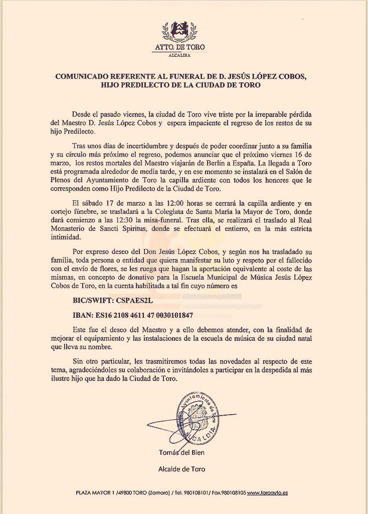 El próximo día 17 tendrá lugar la misa-funeral por Jesús López Cobos. Fue deseo expreso del maestro que en vez de enviar flores se ingresase su importe en la c/c de la Escuela Municipal de Música que lleva su nombre. Adjuntamos el documento del Ayuntamiento de Toro.