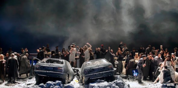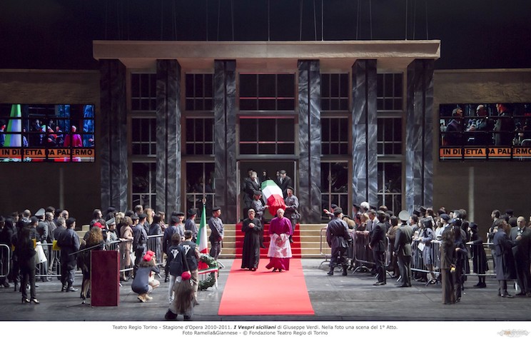 El actual responsable del Palau de les Arts diseñó la presente producción para Turín, aunque después haya viajado a Bilbao y otras capitales. Es posible que en Turín tuviera sentido trasladar la acción original de los hechos históricos de 1282 a la Italia de los años ’70, con la mafia actuando y volando los coches de los jueces Falcone y Borsallino, hecho que en Valencia hoy pocos recordarán. Estas trasposiciones de sucesos reales no suelen resultar, máxime cuando los textos hablan de espadas y no de pistolas y no es posible imaginar a Procida tomado un micrófono para celebrar una rueda de prensa. Hubo el acierto de eliminar el ballet y dejar un único descanso, pues se trata de una ópera larga e irregular, con momentos interesantes pero con otros banales, como buena parte del último acto, resaltado escénicamente en plan kitsch. La escena final en el parlamento italiano, con el artículo 1º de su constitución como fondo, resulta gratuita.