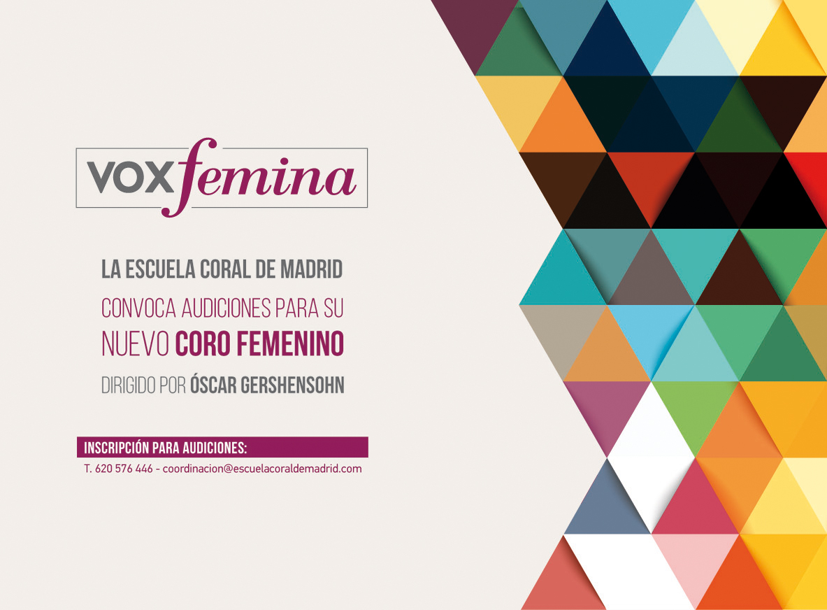 La Escuela Coral de Madrid (ECM) crea Vox Femina, un nuevo coro que estará integrado exclusivamente por mujeres. Esta formación estará dirigida por el maestro Óscar Gershensohn, creador y director de La Capilla Real de Madrid, e impulsor de proyectos de la talla del Círculo Bach, Bach Madrid o el Coro de Niños de la Capilla Real de Madrid.